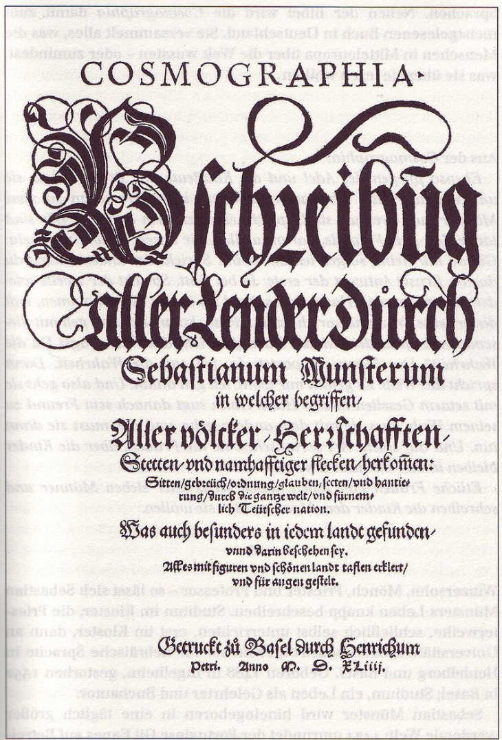 Just as the word choreography literally means “dance-writing” from the Greek words “χορεία” (circular dance, see choreia) and “γραφή” (writing), likewise cosmographia is about representing the world (universe) in writing. I read that the Cosmographia by Sebastian Münster from 1544 is the earliest German description of the world. (also that his famous publication included woodcuts, which apparently contributed to its success)