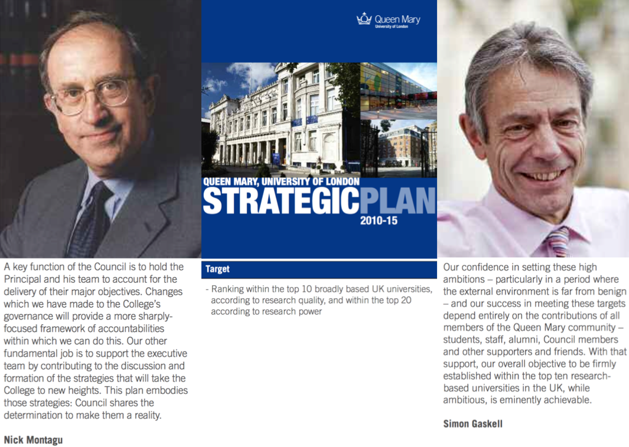 In 2007, I started on my first independent position in the School of Biological and Chemical Sciences at Queen Mary University of London. Two years later Sir Nicholas Montagu was appointed Chairman of Council and Simon Gaskell was appointed Principal of the University. They formulated a strategic plan with the explicit aim to rank QMUL in the UK’s top-ten list according to the Government’s Research Excellence Framework assessment.